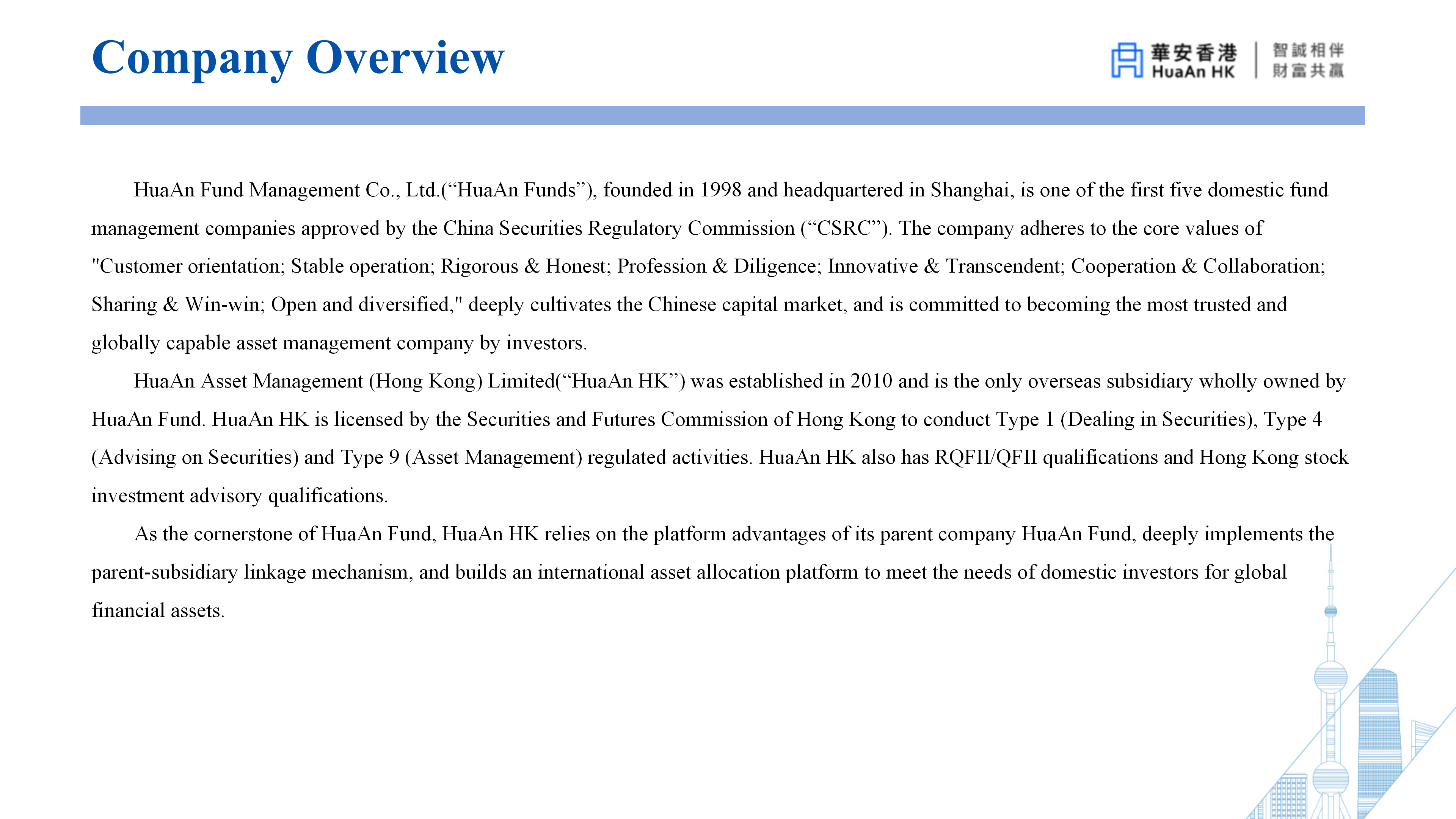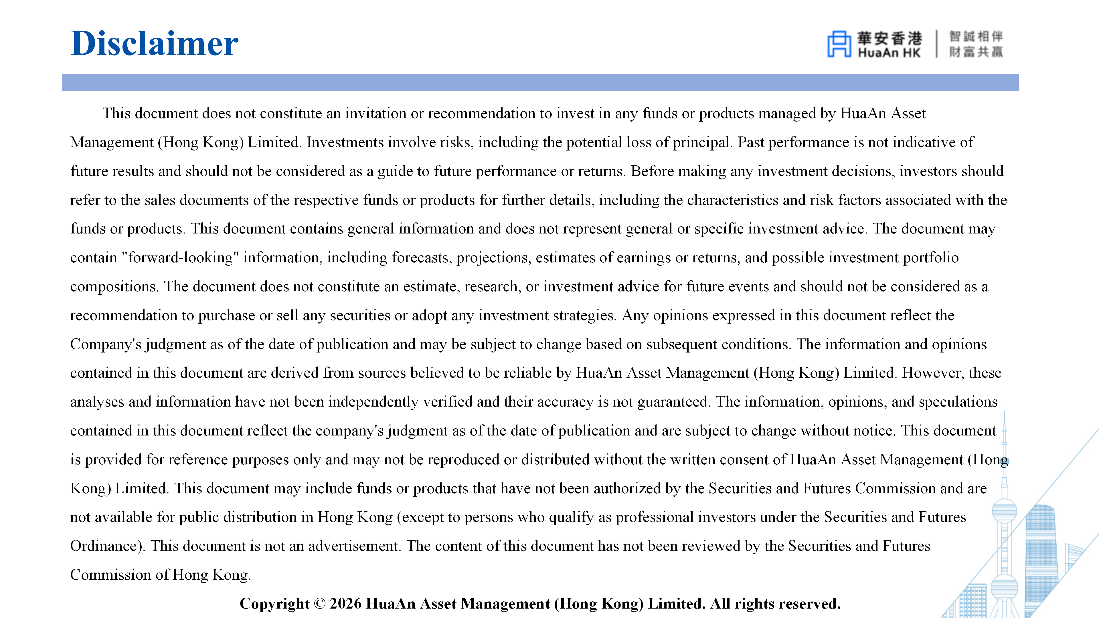 Huaan Asset Management (Hong Kong) Limited ("Huaan Hong Kong") has taken all reasonable and prudent measures to ensure that the data on this website is accurate, timely, complete, suitable for the intended use on the date of publication, and complies with relevant and applicable laws and regulations. However, there is a possibility of errors or omissions in the relevant data due to circumstances beyond the control of Huaan Hong Kong. Huaan Hong Kong makes no guarantee or statement regarding the accuracy or completeness of the data contained on this site. You need to carefully consider and investigate, without relying on any data on this site. Any actions taken by anyone based on the content on this site will be their own responsibility for the risks.