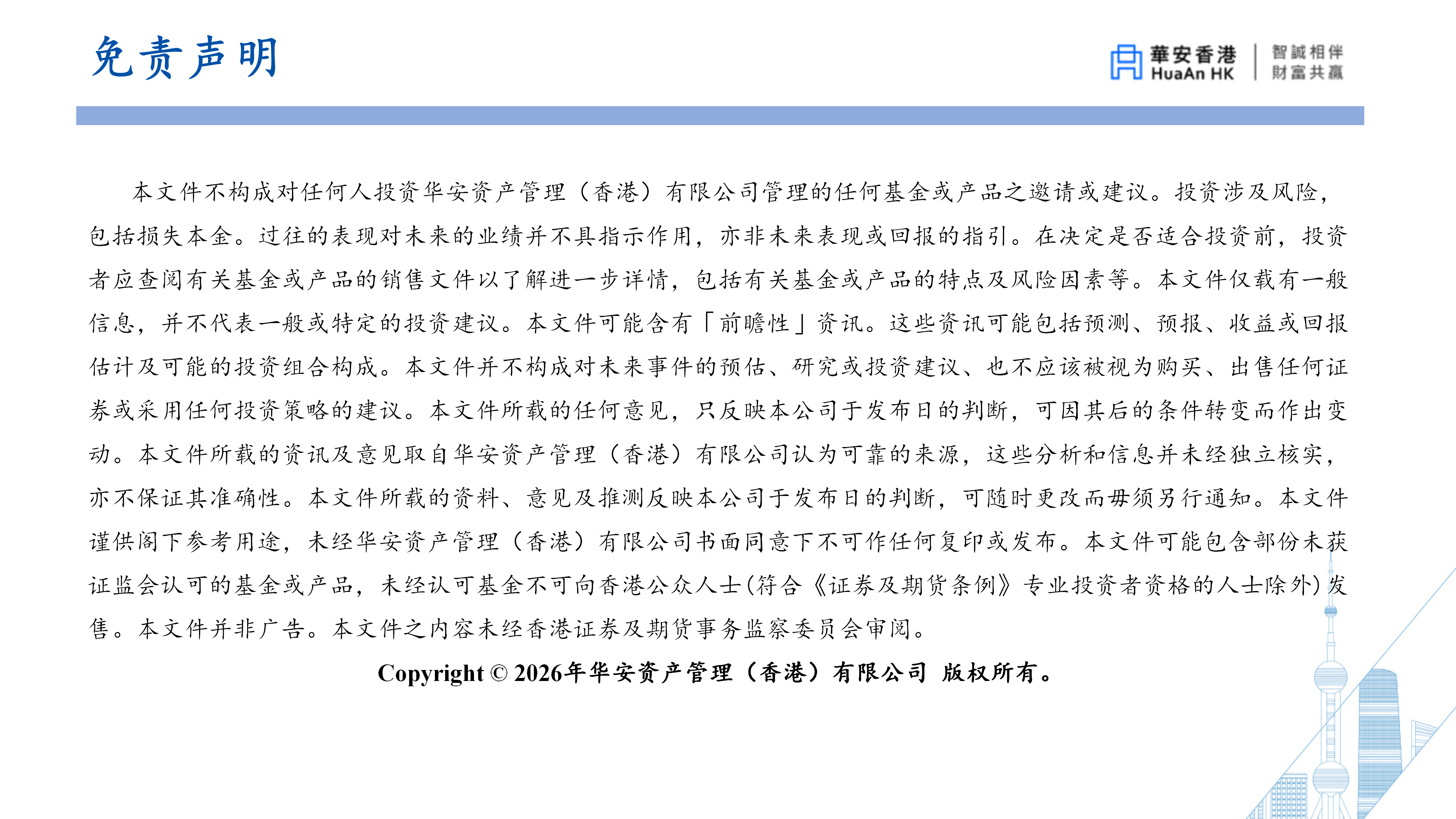華安資產管理(香港)有限公司 (“華安香港”) 已採取一切合理審慎措施,以確保本網站所載資料於發布當日乃屬準確、合時、完整、適合作擬定用途,以及遵從相關及適用法例和規例。雖然如此,有關資料有可能因華安香港無法控制的情況而出現錯誤或遺漏,華安香港概不就本網站所載資料的準確性或完整性作出任何保證或聲明。閣下需審慎考慮及調查,而不依賴於任何在本網站上的資料。任何人士基於本網站上的內容作出的行動,風險將為其本人負責。